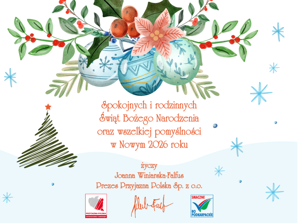 🌟 Składamy wszystkim naszym Klientem i Partnerom Programu “Smaczne bo Podkarpackie” najserdeczniejsze życzenia świąteczne – pełne spokoju, radości i dobrej atmosfery 🎄